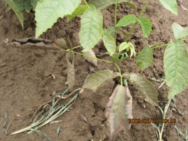 3.2 发病规律:病菌在落叶或感病枝条等病残组织内越冬,翌年春天形成分生孢子,借风、雨传播。雨水多的年份发病重,雨后高温高湿情况下发展迅速。