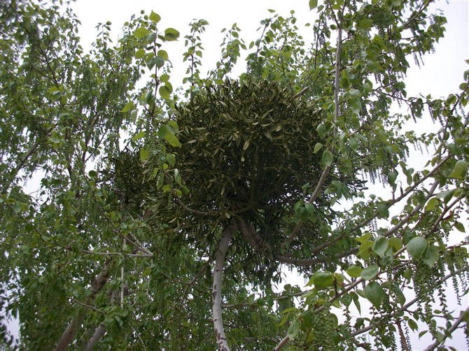 您看到的杨树上生长一种植物,酷似是鸟窝,实际上它是冬青寄生在杨树的。